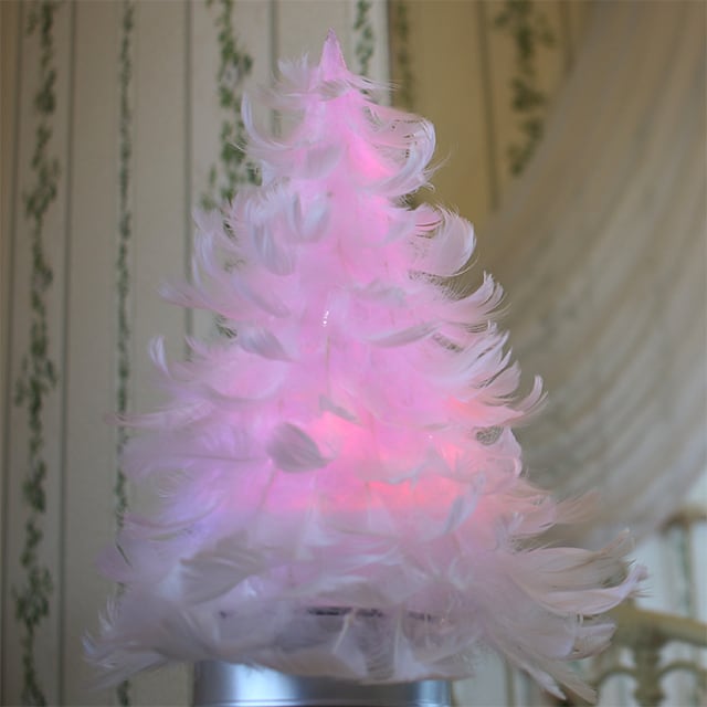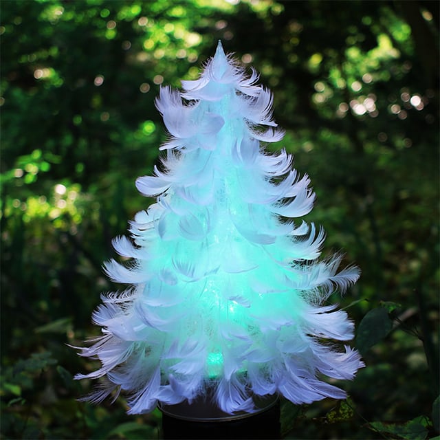 (色つきのLEDを下から灯せば、羽ツリーもその色に光ります。)
